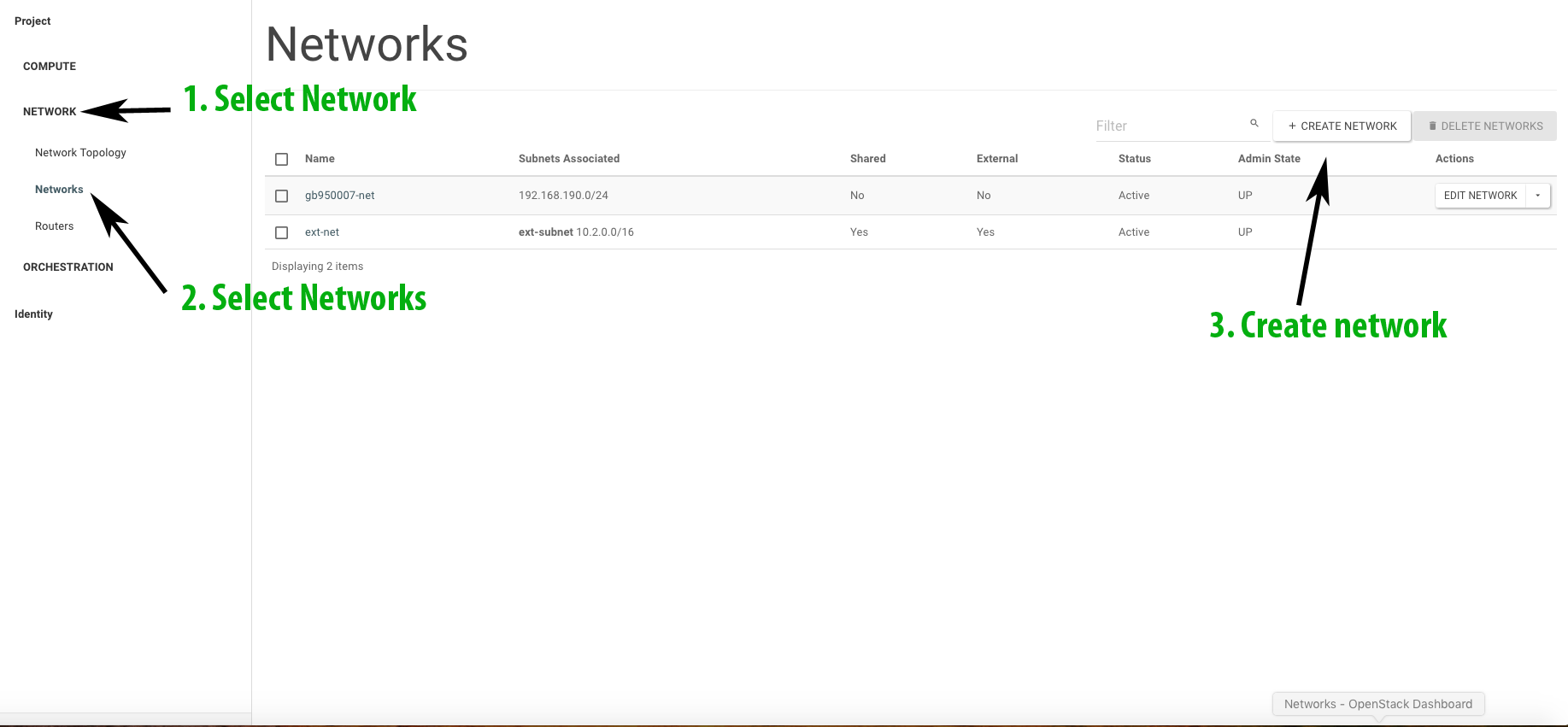 Log in to the Openstack web dashboard in which you want to create a network. So, on the left side of the page, click on Network, then Networks and go to create a network as shown in the following figure.