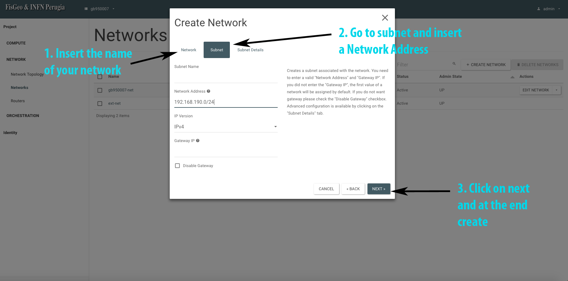 In the new window that opens, in the section Network choose a name for your Network. Then go to subnet and insert a network address. After that click on next and create your network.