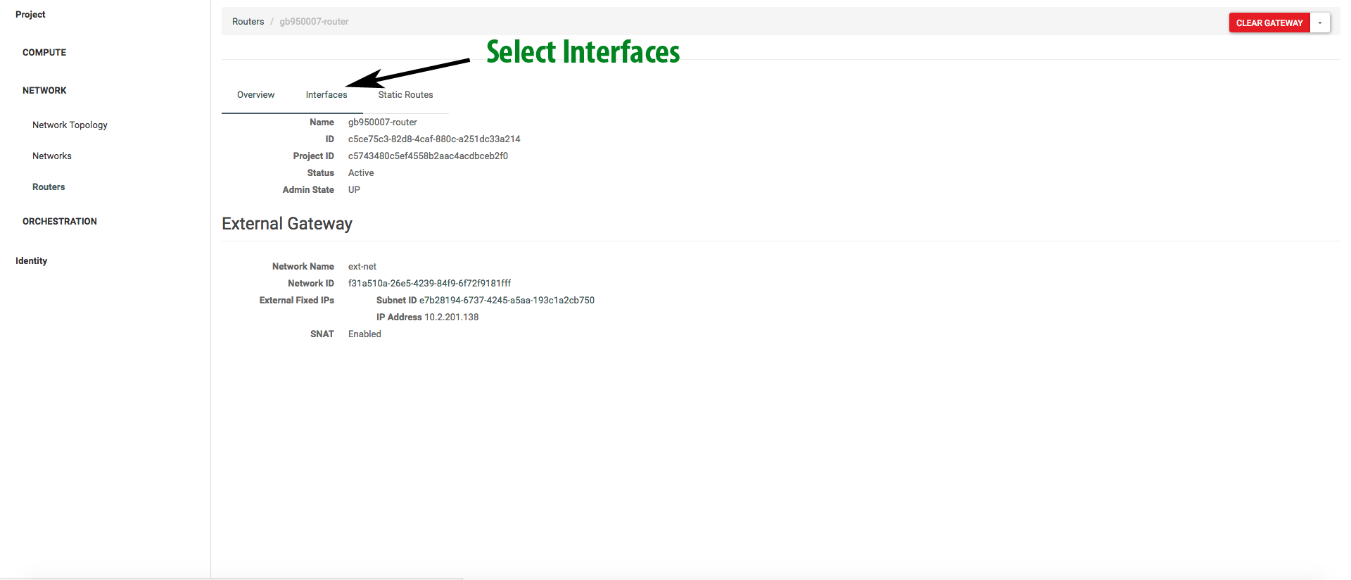 To terminate the router configuration, we need to configure an interface and connect it to the previously created internal network. To do this, go back to the Network -> Routers section and select the newly created router, as shown in the figure