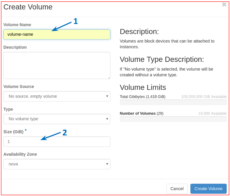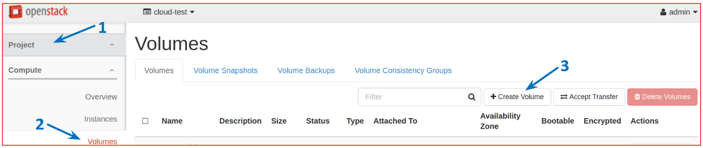 In the left panel, click Project, then Volumes and then the Create Volume button in the upper right part of the page.