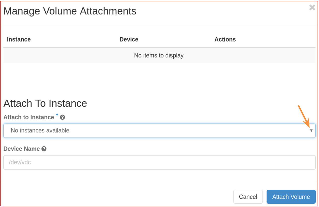 In the new window, in Attach to Instance menu, select the VM to which you need to attach the volume, and then click Attach Volume.