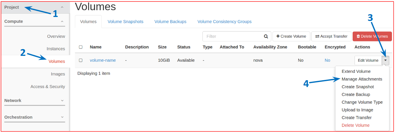 To attach the volume to a VM in the same project, click Project, and then Volumes. Click the menu under Actions corresponding to the volume you have created and select Manage Attachments, as shown.