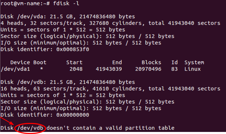 The result is similar to the one shown in the figure, where the name of the device we want to configure (in this example /dev/vdb) is enlighted.