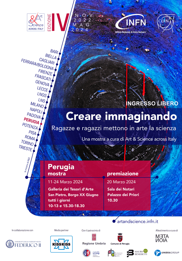 Dal 11 al 24 marzo 2024 la Galleria Tesori d'Arte a San Pietro in Borgo XX Giugno ospiterà la tappa di Perugia della mostra "Creare Immaginando. Ragazze e ragazzi mettono in arte la scienza"del progetto nazionale per le scuole di secondo grado "Art&Science across Italy", realizzato dall'INFN e dal CERN in collaborazione con le Università italiane.Il progetto ha lo scopo di avvicinare ragazze e ragazzi al mondo della scienz utilizzando il linguaggio dell'arte; giunto alla IV edizione, vede la partecipazione di 19 sedi in tutta Italia.