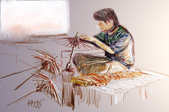donna che ripara ombrelli Thailandia