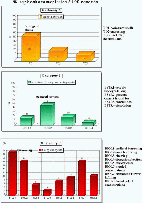 Quantitative analysis involves 450 skeletal concentrations. Database involves representative taphocharacters of about 100 records, plotted (see the following diagrams) considering all 25 subcategories of main 4 categories (A,B,C,D) of this study. |