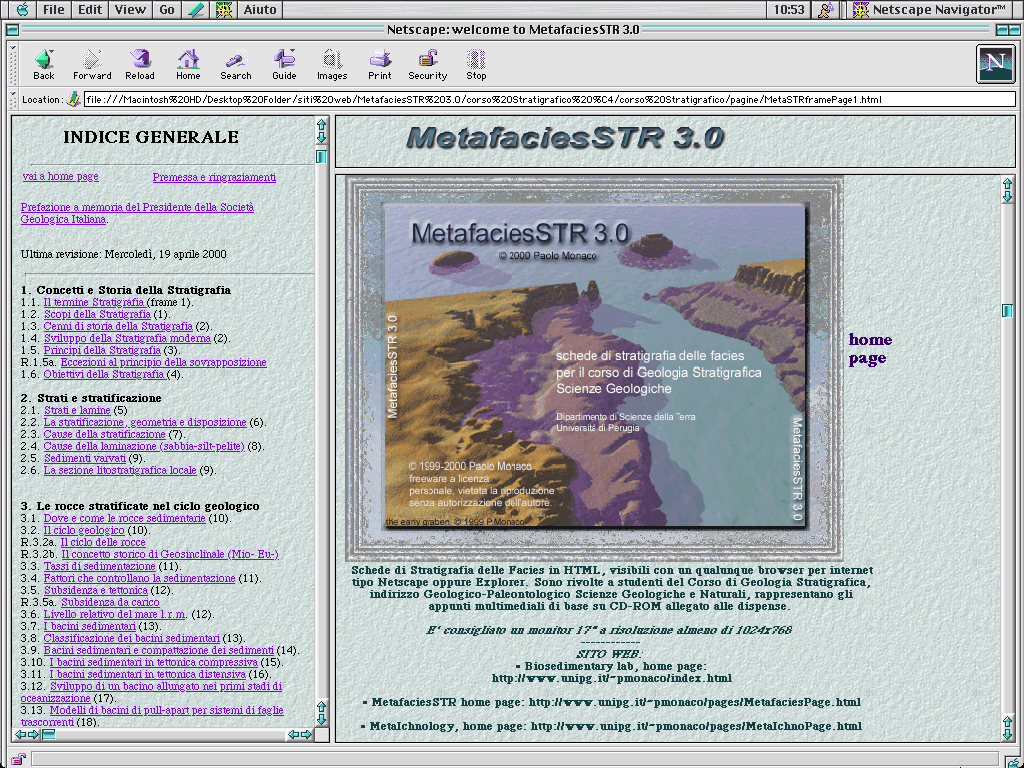 MetaFaciesSTR (© 1997-2011 Laboratorio di Stratigrafia) è costituito da schede (vedi figure) con rimandi a lista per ogni argomento, dalla sezione 1 con introduzione - metodi, alla 12 relativa alla Stratigrafia delle sequenze (e in più vi sono rimandi specialistici R per ogni sezione e riferimenti bibliografici per ogni sezione). Il corso costituisce il primo tentativo di rappresentazione multimediale (la vers. per Mac é elaborata come self-running application o ipertesto autonomo mediante riferimenti quali menu, frecce di navigazione e bottoni di rimando a frames più specialistici)., in HTML e visualizzabile con Explorer o Navigator è fornito su CD-ROM. Particolare attenzione è stata rivolta alla bibliografia, aggiornata secondo gli sviluppi recenti della Stratigrafia. |